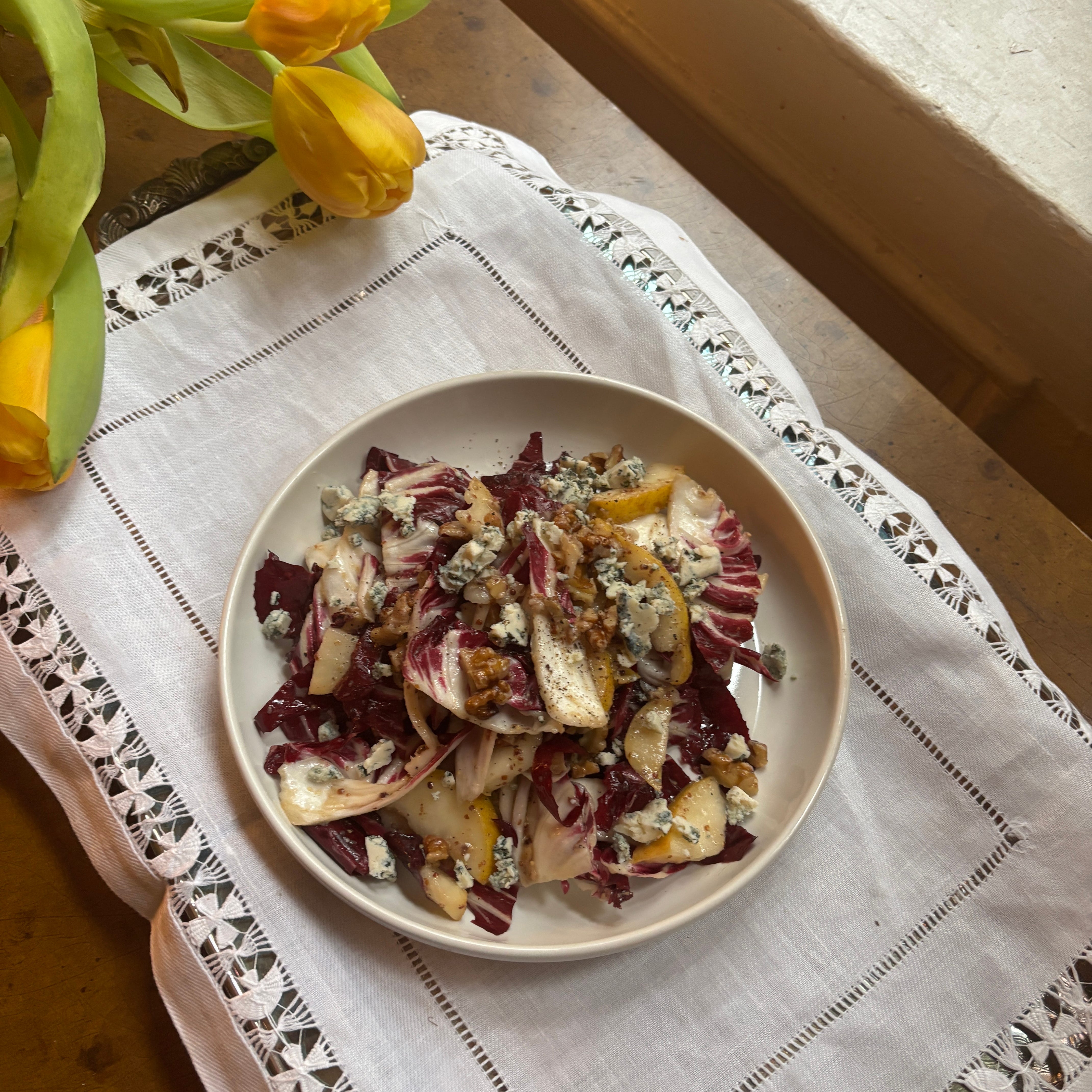 Chafing at the sedate, I spent a small fortune on Swedish salted licorice1 and peeled leaves off bitter chicories at home. Sensory provocation would drop me from pitch-black evenings into the fizz. I thought of one October “breakfast”: red wine followed by a salad of Castelfranco, fragola grapes, crumbled gorgonzola, and mint (really I was waking up at 10:30 and getting into town by 1 to eat). I iterated with radicchio, thinly sliced pear, toasted walnuts, and crumbled Danish blue. Red wine saffron vinegar and grainy mustard in the dressing.2